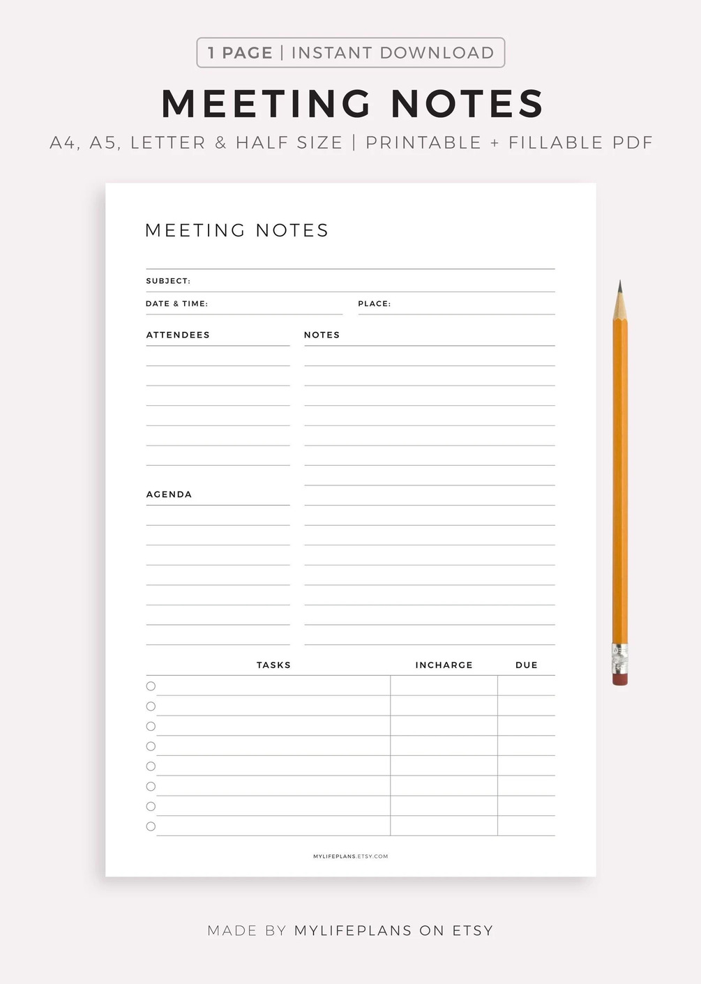 This is printable meeting notes template. Just download, print and get started right away!